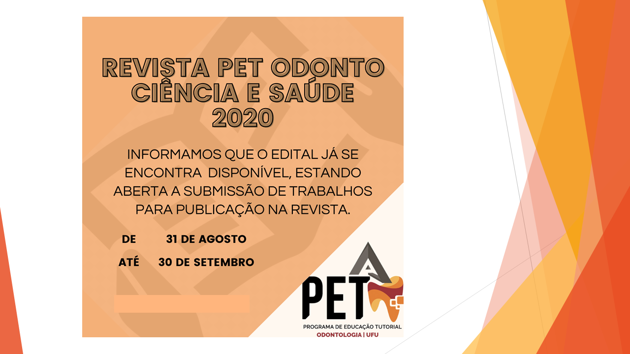 Disponível o Edital sobre Normas para submissão de trabalhos (casos clínicos, pesquisas, textos informativos e reportagens) - Revista PET Odonto Ciência e Saúde, Volume VII, dezembro de 2020.