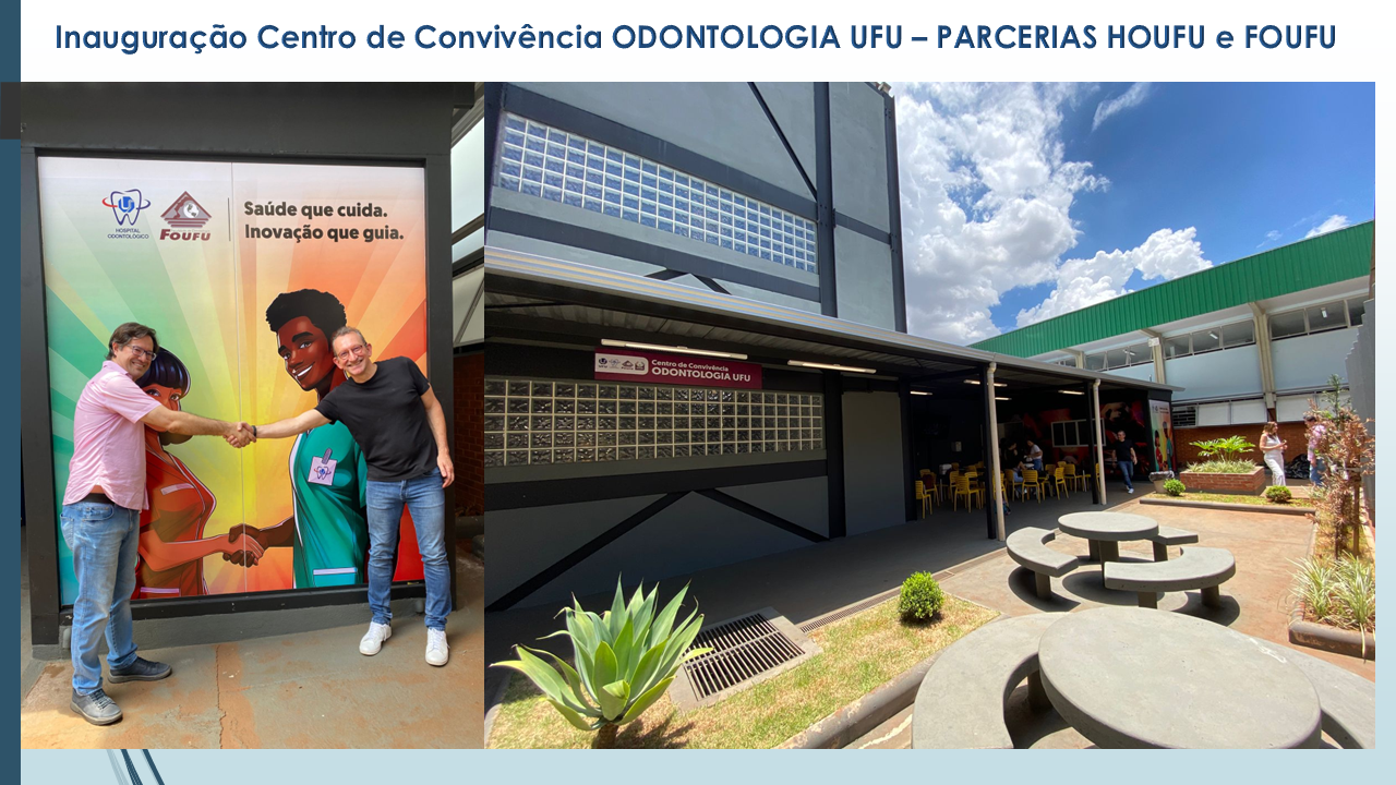 No dia 10 de dezembro de 2024 aconteceu a inauguração do Centro de Convivência Odontologia UFU, no bloco 4L, campus Umuarama. Uma iniciativa do Hospital Odontológico da UFU (HOUFU), sob a direção do Prof. Dr. Carlos José Soares, em parceria com a Faculdade de Odontologia da UFU (FOUFU), sob a direção do Prof. Dr. Sérgio Vitorino Cardoso. O espaço, anteriormente inutilizado, foi transformado em um local com o objetivo de proporcionar socialização, descanso, confraternizações, dos servidores FOUFU e HOUFU e discentes do curso de graduação e Pós-graduação da FOUFU. Na reforma do espaço foi instalado um contêiner, estilo cozinha, totalmente climatizada, com dois refrigeradores, bancada com dois micro-ondas, para armazenar e aquecer alimentos, respectivamente, cuba para higienização de talheres, vasilhas, marmitas e louças, uma mesa e cadeiras para refeições. O espaço externo foi coberto e disponibilizado na área social mesas e cadeiras, além de um aparelho de TV 75", de uso geral. O Centro de Convivência também é um espaço destinado à realização de pesquisas qualitativas e demais atividades integrativas ao ar livre para a comunidade HOUFU e FOUFU
